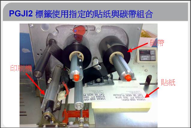 ! 自行於廠內標籤機印製 時(UL PGJI2),其 空白標籤底紙 及 碳帶 組合須為 UL PGJI2 等級,且其PGJI2標籤材質可適合貼於 產品的表面 (PC塑膠表面)及耐溫至少須符合該表面承受之最高溫度C。請供應商於每捲 空白標籤底紙 及 碳帶 包裝上,必須標示出以下2種必要的資訊 (請見 PGJI2 UL 範例檔 )