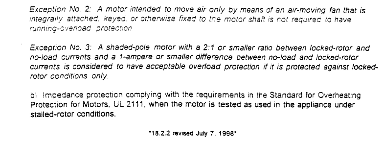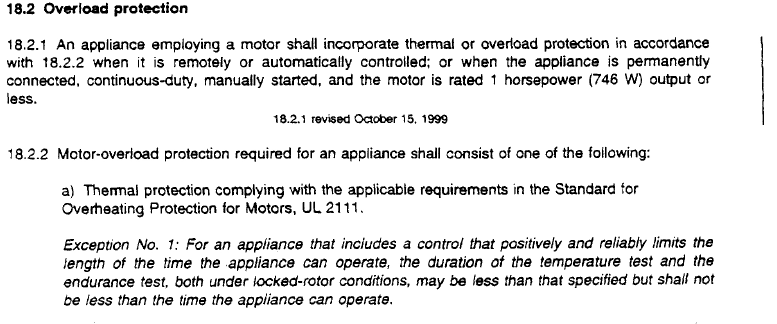 又於18.2.2 節規定,使用之馬達過載保護必須符合UL 2111,除非符合Exception No. 1, 2, 或 3